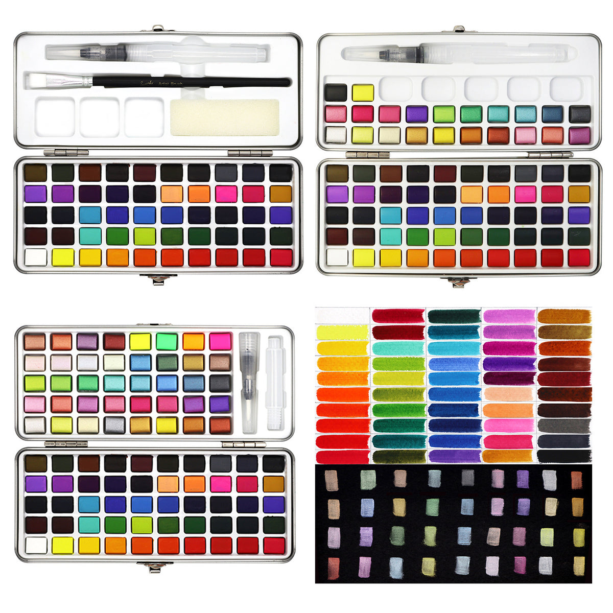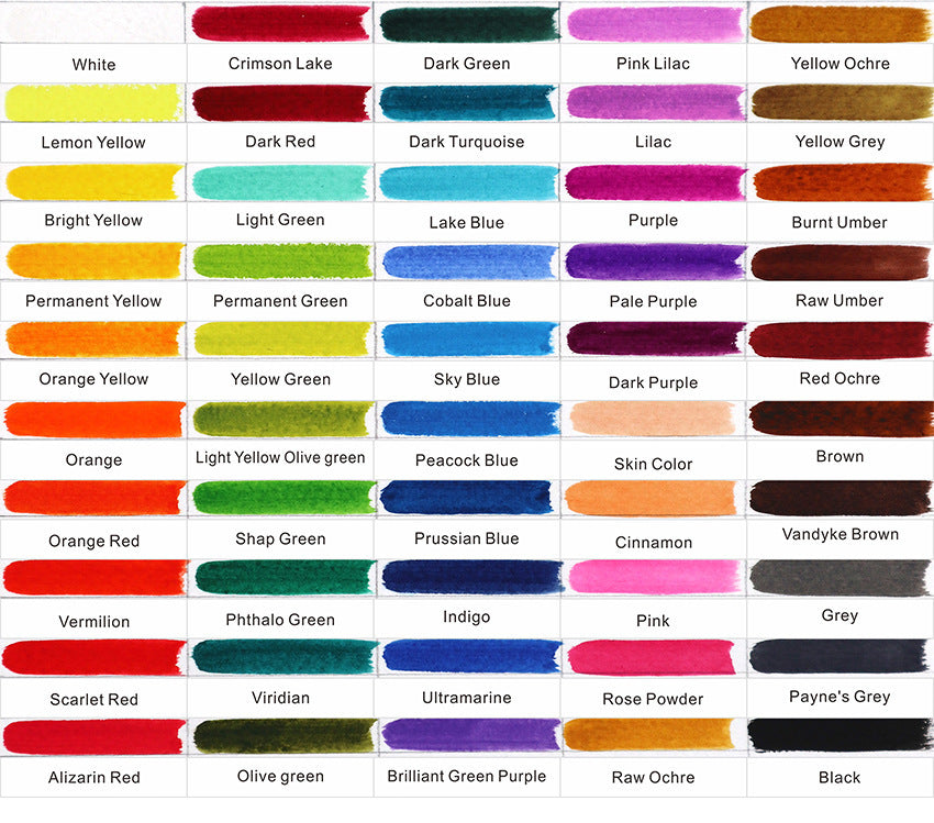 Watercolor brush*1, 6 hook line pens, *1 palette, 50 color solid watercolor·, sponge water storage brush*1, color test card*1,